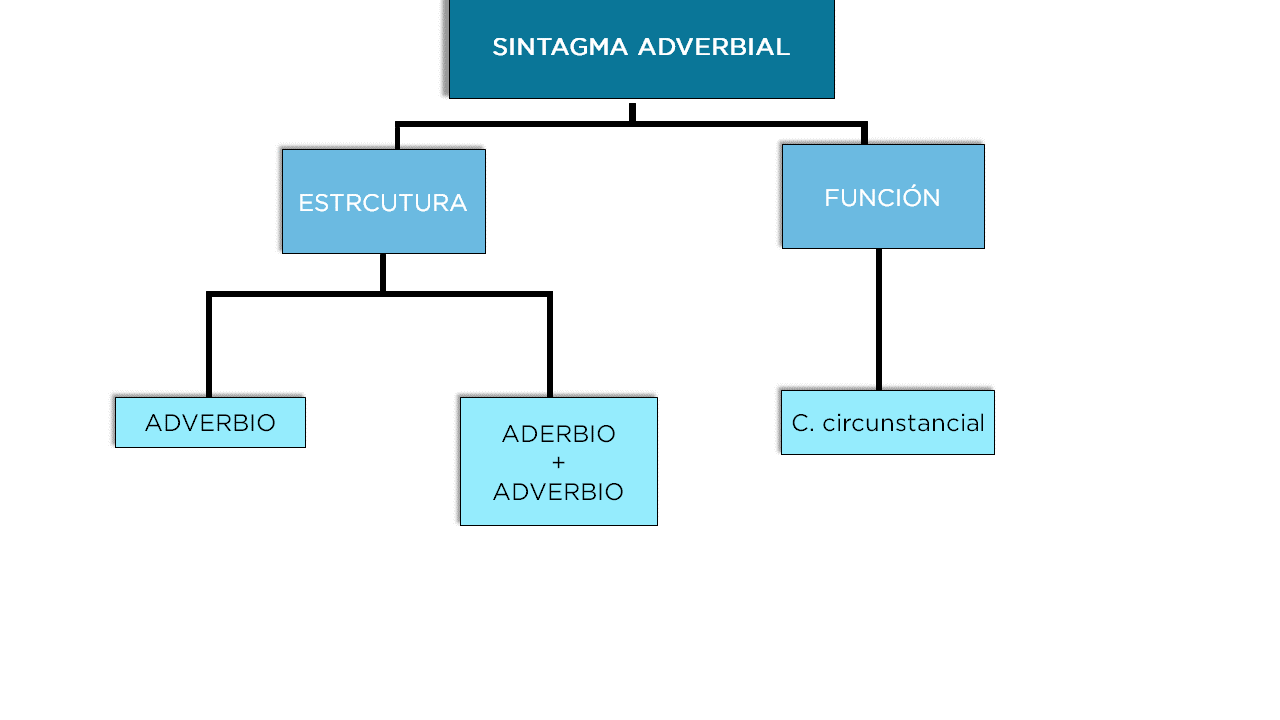 El núcleo de su estructura lo forma,un adverbio, que puede modificar o ser modificado por otro adverbio, por un adjetivo o por un verbo. En algunos casos los sintagmas adverbiales pueden ser una variante del sintagma verbal que se caracteriza por tener como núcleo un verbo. Es decir, que cuando existe un sintagma verbal, como por ejemplo he acabado, al agregársele un adverbio, forma entonces un sintagma adverbial: he acabado mal, he acabado pronto. En este caso el sintagma puede clasificarse en cualquiera de las dos categorías, según se considere el verbo o el adverbio como el núcleo del sintagma.